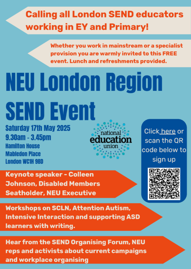 If you’d like to learn more about supporting autistic pupils with writing, I’ll be hosting a FREE masterclasses at the NEU London Region SEND event on Saturday, May 17th. Details are on the flyer below.