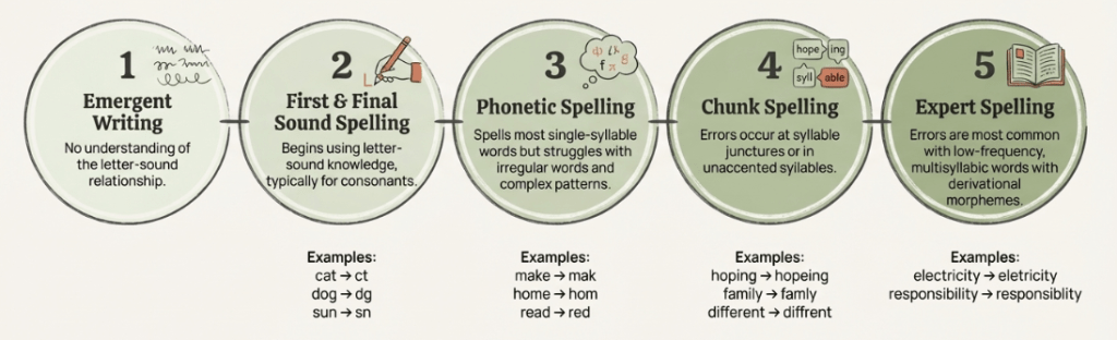 Students’ abilities in word writing develop along a continuum, moving through distinct phases that are greatly facilitated by systematic instruction and meaningful writing experiences. For word writing, this progression is often conceptualised in five phases: